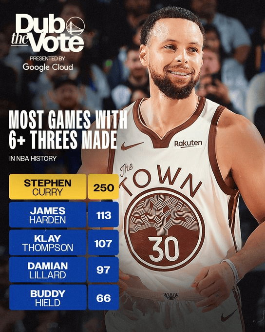 今日港盛国际,勇士官方更新动态:库里是历史第一位250场投中6+记三分的球员!